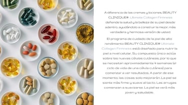 Ultimate COLLAGEN FIRMNESS de BEAUTY CLINIQUE® ha sido diseñado para ayudar al cuerpo a recuperarse y afinar la capacidad natural de renovación celular de la piel a través de la nutrición. Viene en 30 dosis fáciles de tomar el ciclo de vida completo de una generación de células de la piel.